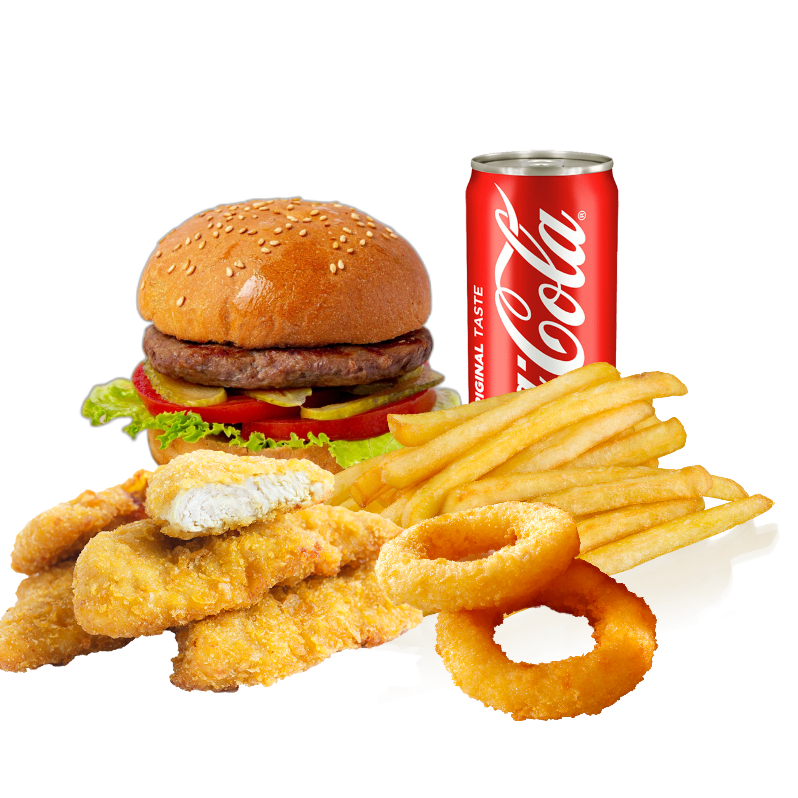 Klasik Burger + 4 Adet Çıtır Tavuk + 2 Adet Soğan Halkası + Patates Kızartması (150 gr.) + Kutu İçecek