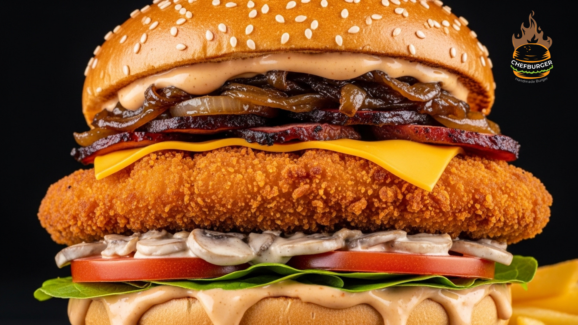 Tavuk eti, yeşillik, domates, füme et, cheddar peyniri, karamelize mantar, karamelize soğan, dip sos ve 150 gr. patates kızartması