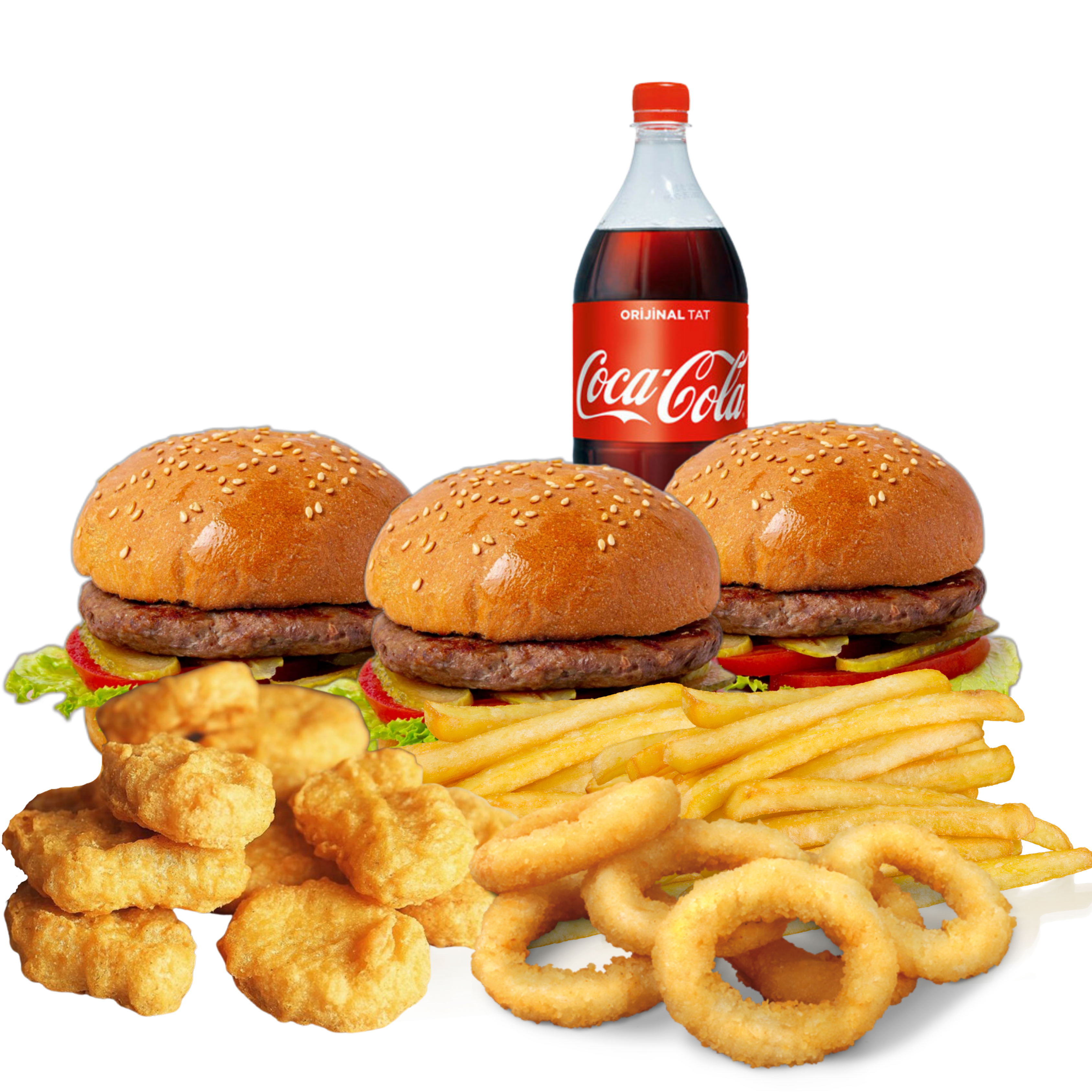 3 Adet Klasik Burger + 12 Adet Nugget + 6 Adet Soğan Halkası + Patates Kızartması (350 gr.) + İçecek (1 L.)